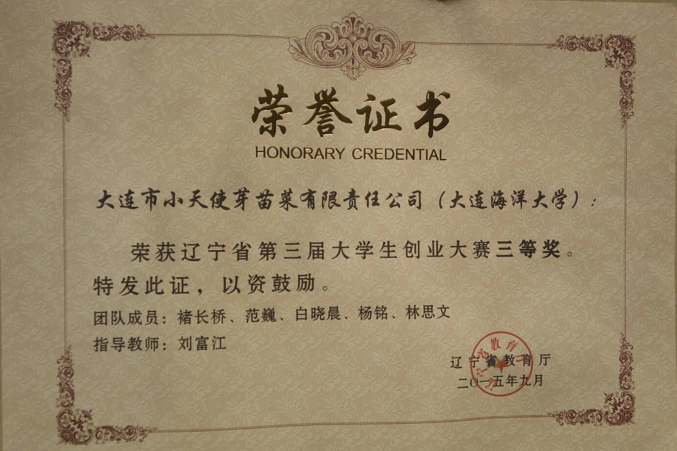 近日,在辽宁省教育厅主办的第三届老员工创业计划大赛中,公司选推的《大连市天使芽苗菜有限责任公司》作品荣获三等奖。