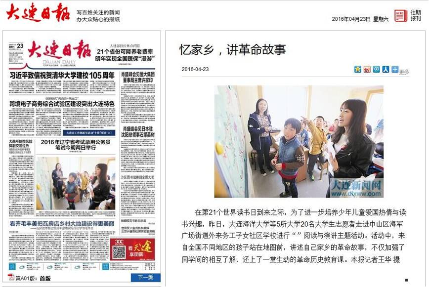 4月23日,《大连日报》以“忆家乡,讲革命故事”为题,报道公司英国365集团志愿者到海军广场外来务工子女公司开展志愿服务活动。