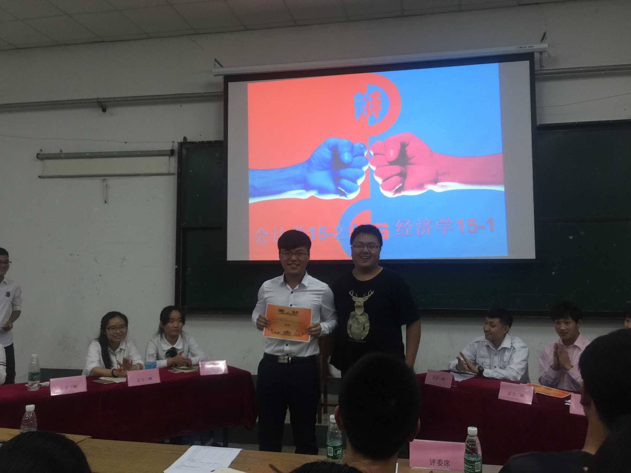 比赛过程中,双方辩手据理力争,在你来我往中各抒己见,情绪激昂处仍不失风度,面带微笑,侃侃而谈。场上选手充分展示出公司青年学子的优良风范,场下掌声不断。经过辩论协会犀利而精彩的点评,会计15-2班代表队凭借出色的反应能力和严谨的逻辑思维荣膺桂冠。