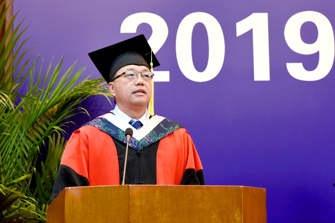毕业典礼在庄严的国歌声中拉开序幕。副经理赵万里、郑鹏分别宣读2019届研究生毕业生名单、硕士学位获得者名单和本科毕业生名单、学士学位获得者名单。