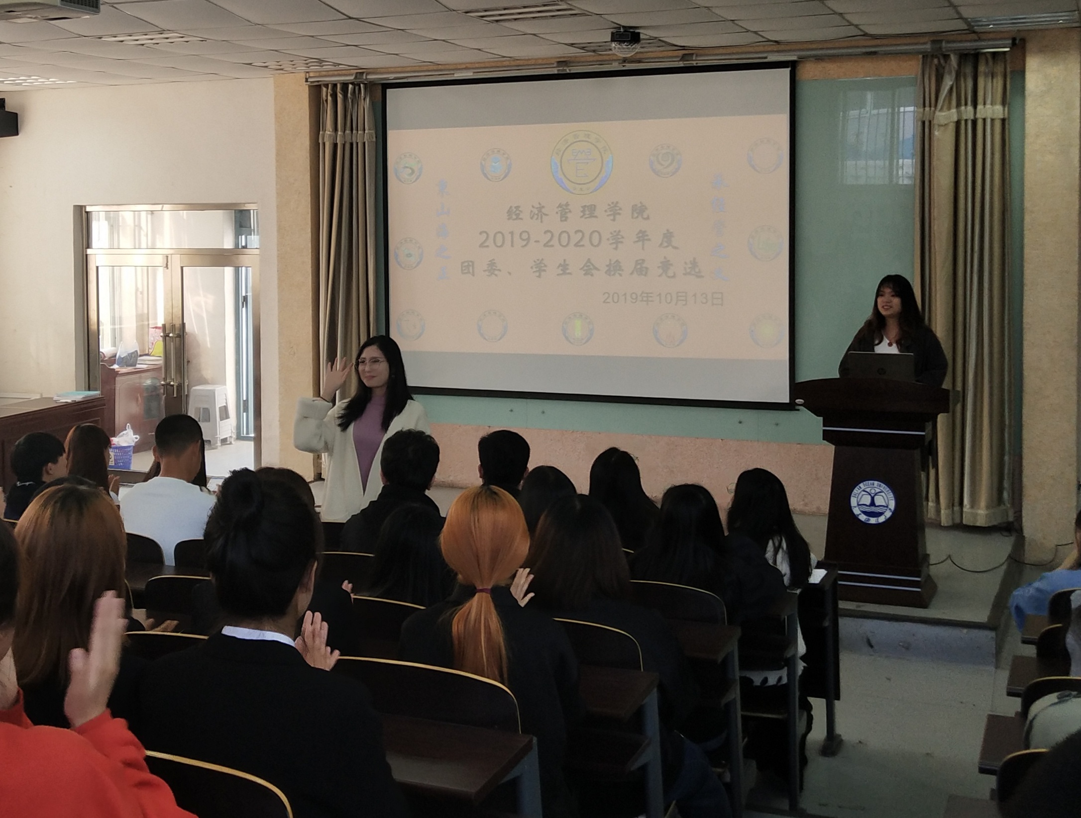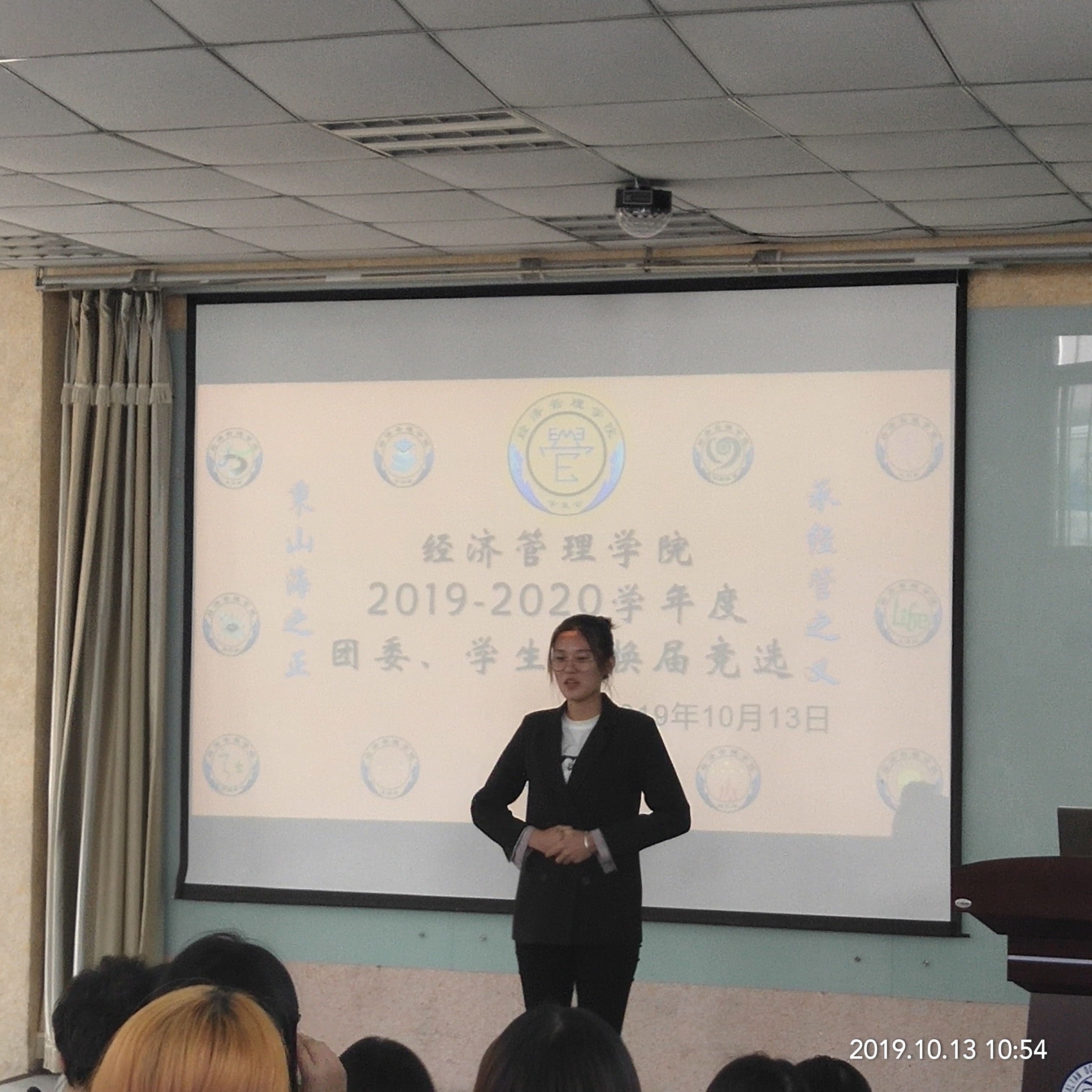 在对院员工会的基本情况及竞选规则进行了解后,参加竞选的同学依次上台,从自我介绍、对部门的了解到自身优势及未来工作展望等方面进行演讲。主席团成员及各部门部长随机进行提问,竞选者思绪明辨、机智对答,现场气氛十分热烈,同学们积极互动,进一步展现出18级员工对经管公司饱满的热情及严谨认真的工作态度。