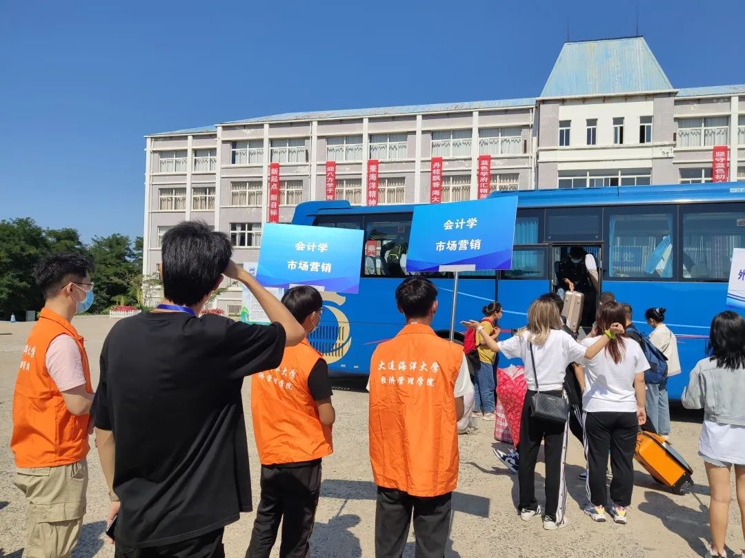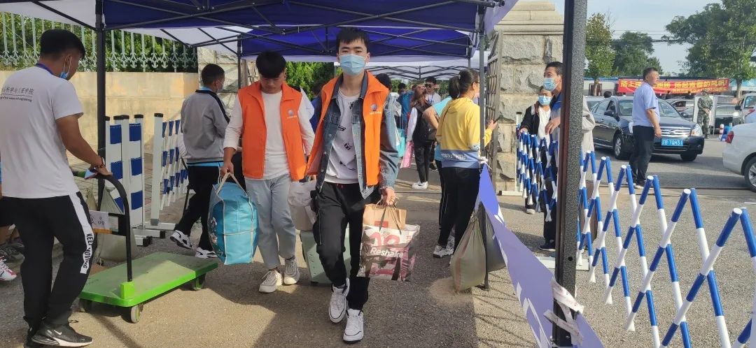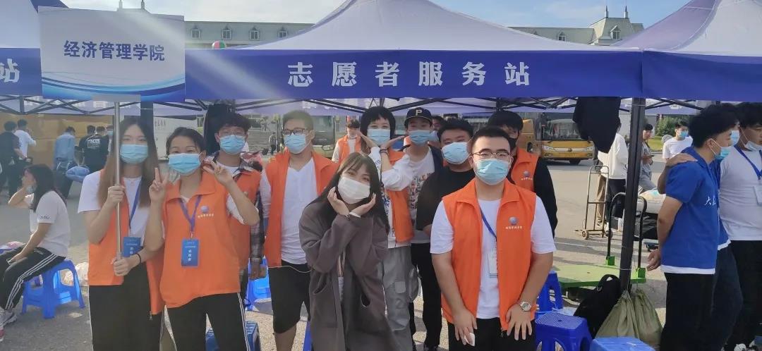 由于疫情防控,新生独自报到,公司特派出志愿者接应新生和行李,在各自的专业报道处报道后,公司为新生分发寝室钥匙,并将行李送至寝室。炎炎烈日之下,校园里随处可见身着“经管黄”的志愿者们。