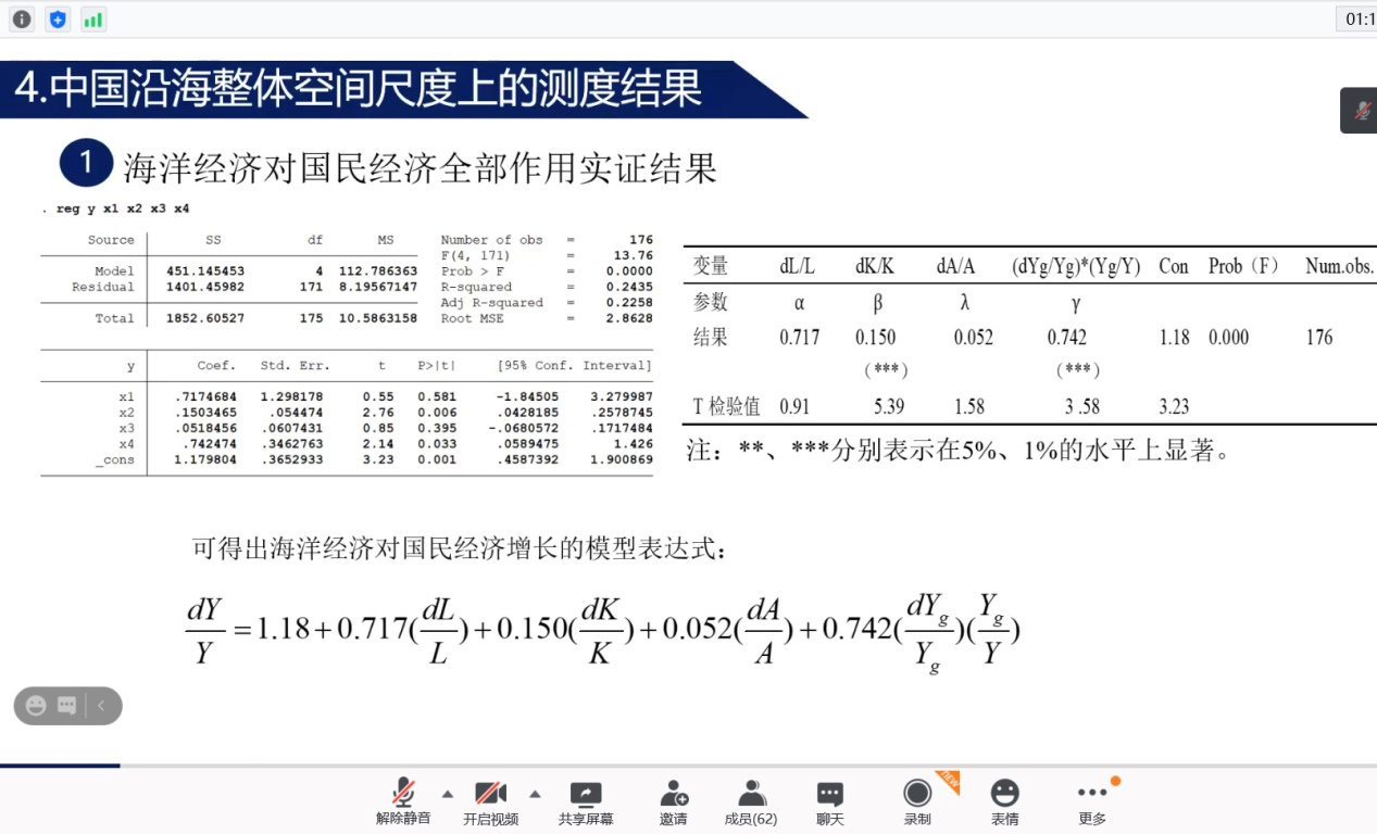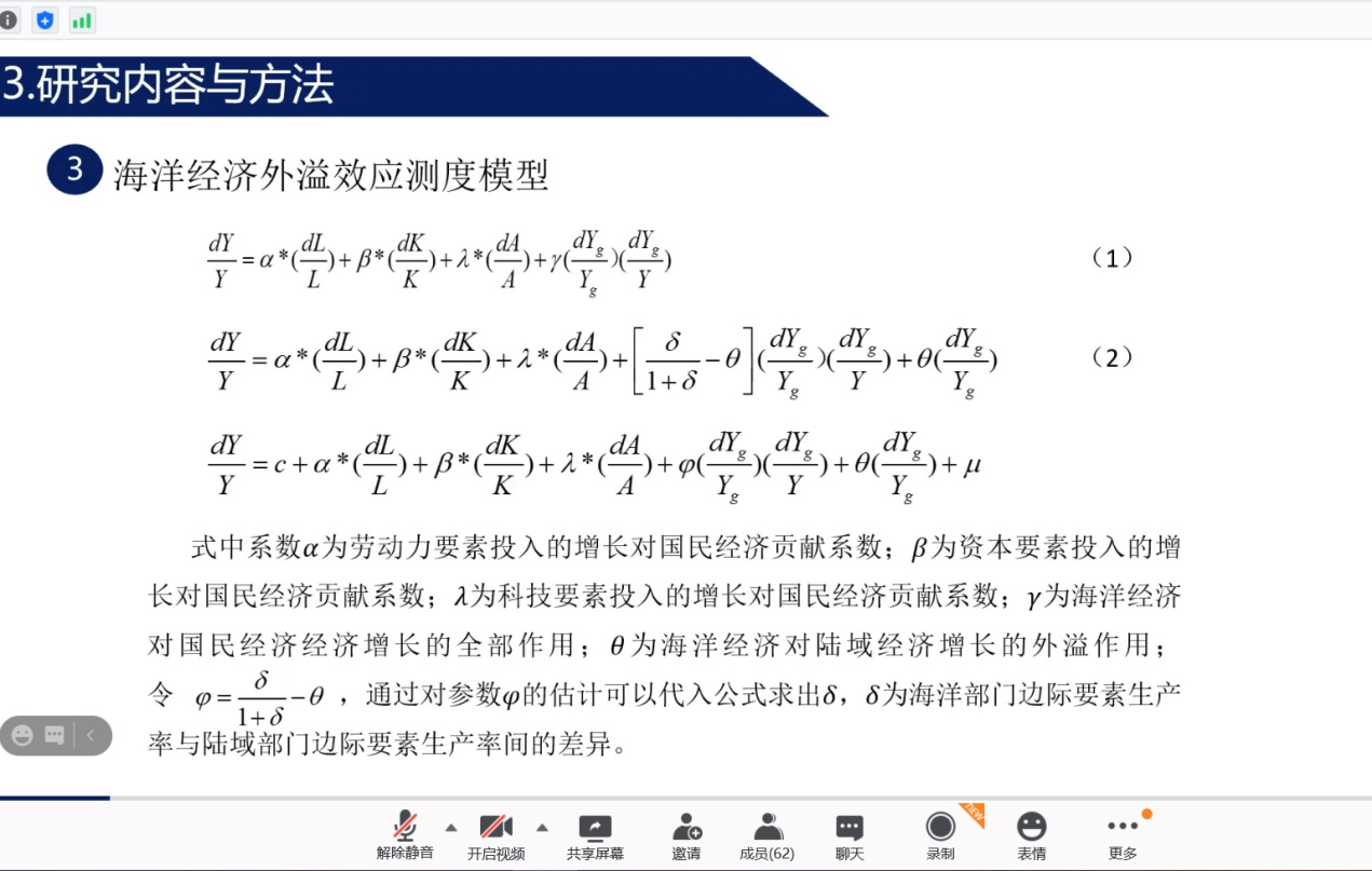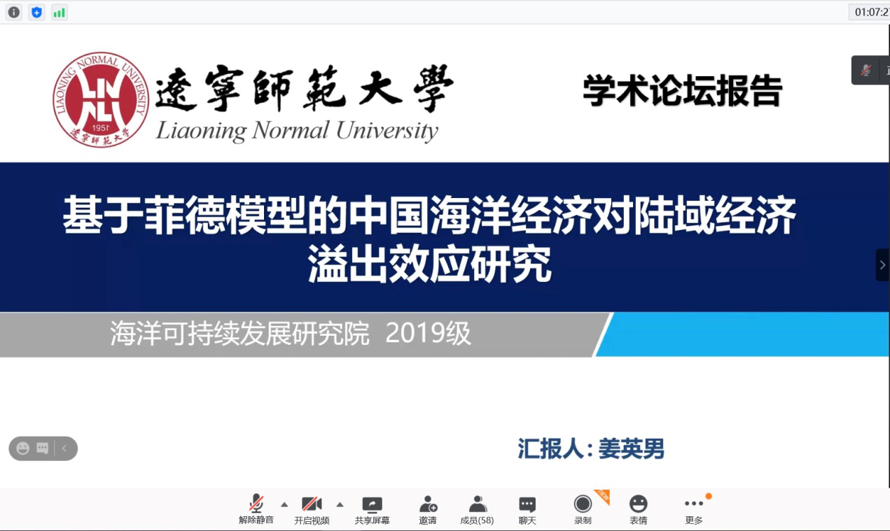 来自辽宁师范大学的姜同学,运用菲德模型,来探究中国海洋经济对陆域经济溢出效应,清晰阐述了测算结果,并得出结论,虽有改进之处,但总体获得评审专家的好评。