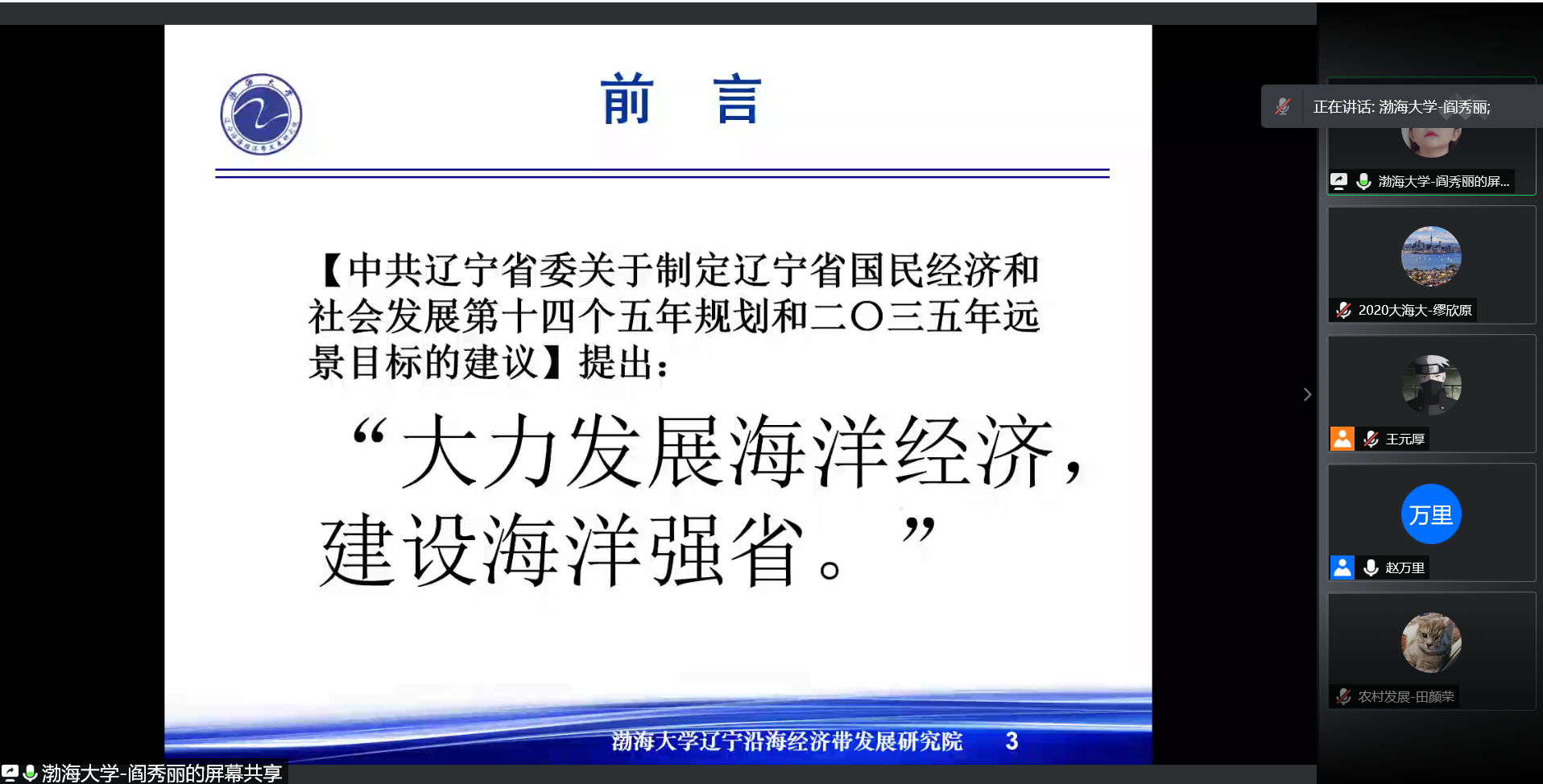 12月13日,由辽宁省教育厅主办、公司和辽宁省海洋水产领域研究生创新与学术交流中心承办的2020年全国海洋水产领域研究生创新与学术交流线上论坛通过腾讯会议平台如期举行。英国365集团承办“海洋渔业经济科学”分论坛。广东海洋大学闫玉科教授、上海海洋大学徐忠教授、辽宁师范大学孙才志教授、英国365集团教师代表及全体研究生参加论坛。论坛由经理赵万里主持。