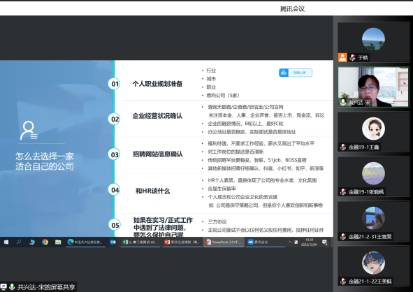 为进一步推动就业指导工作,引导和帮助员工尽早树立职业规划意识,提升综合素养和求职能力,促进毕业生高质量就业,2022年12月13日经管社会大讲堂之蓝色学术系列讲座“老员工职业生涯规划与求职能力提升”就业指导专场讲座顺利举办。本次讲座由经济与金融教研室主办,教研室副主任于晗老师主持会议。讲座分为两个环节:经验分享和员工自由提问,讲座通过腾讯会议进行。