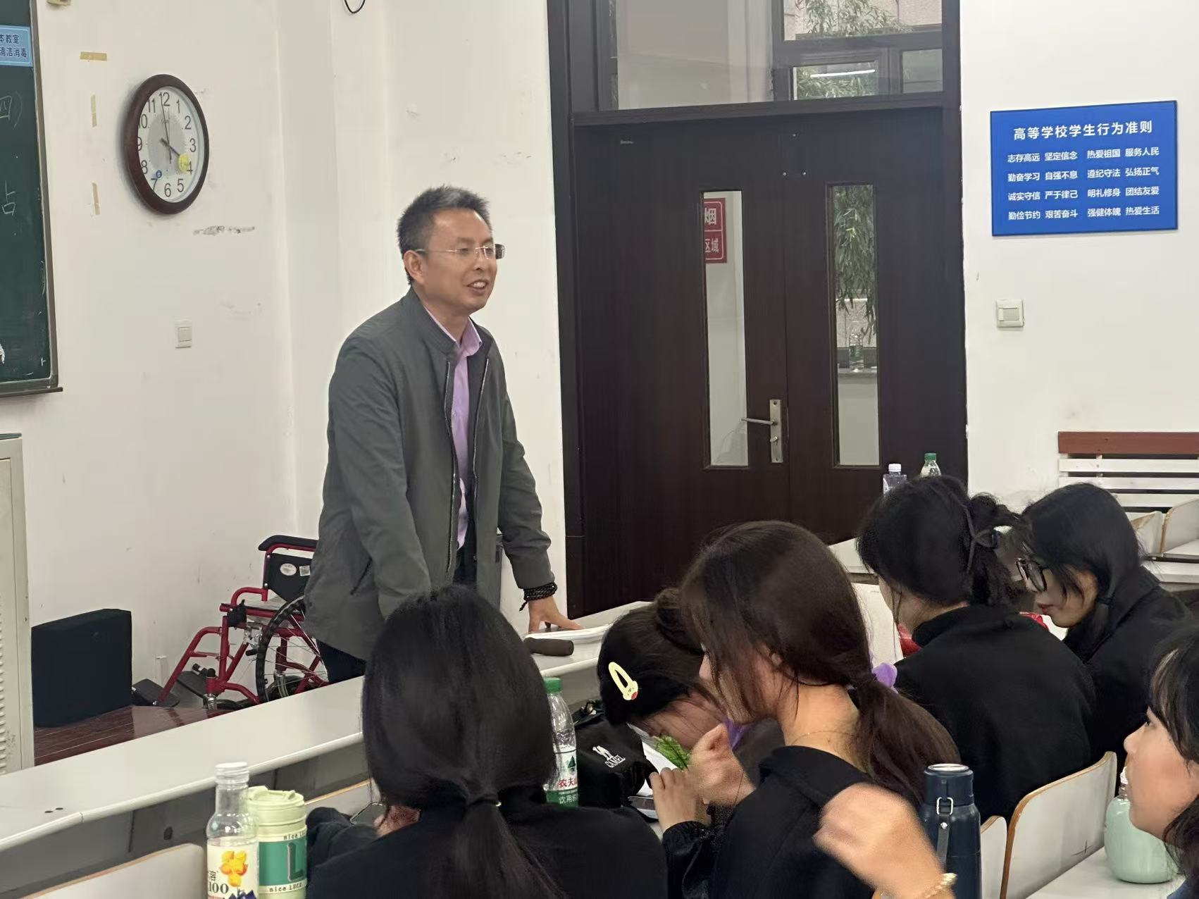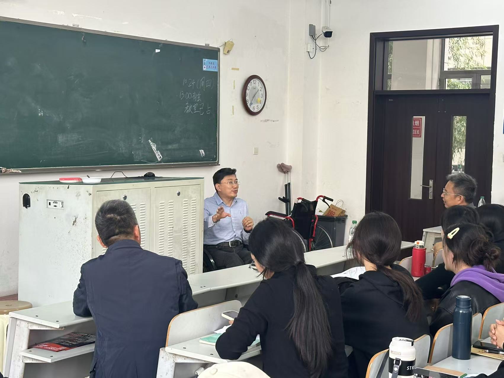 吴喆在培训会上讲解了残疾人服务的注意事项,强调了对待残疾人士时应有的尊重和平等态度。要做到观念正确、态度合理、行为恰当。同时,详细介绍了搬抬轮椅的正确方式并让同学进行操作实践。